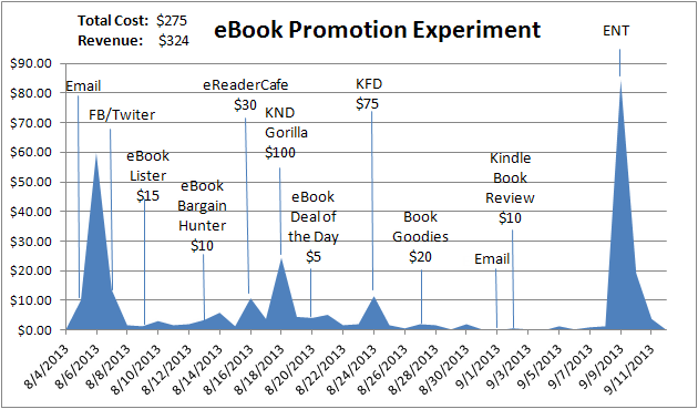 So, I did a 6-week experiment, pricing a book at 99-cents and then promoting it on a different site every 3 to 5 days, all the while tracking the sales daily. Based on the price, my cut was 35-cents per book. I started by sending out a newsletter to the fans who have signed up for it, then posted on Facebook and Twitter, and then the various sites.